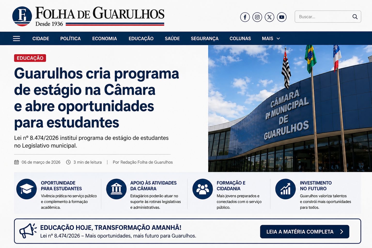 A Lei nº 8.474, de 6 de março de 2026, instituiu o Programa de Estágio de Estudantes no âmbito da Câmara Municipal de Guarulhos. A norma tem como objetivo proporcionar complementação do ensino e da aprendizagem, aperfeiçoamento profissional e formação de pessoal para o setor público.